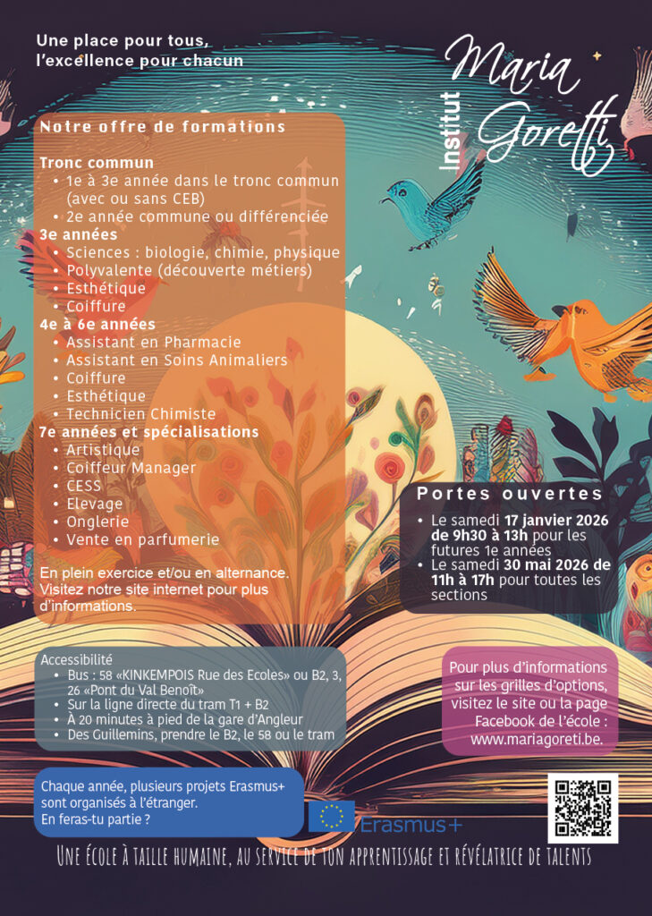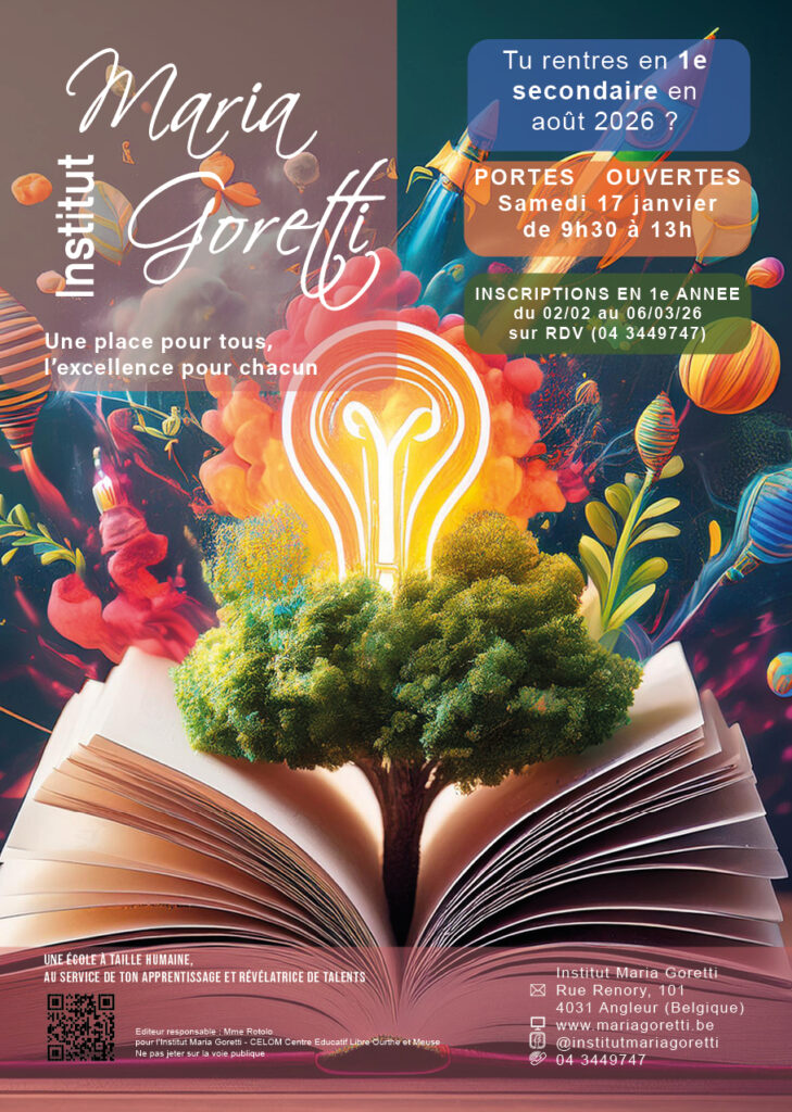 - Portes ouvertes pour les futurs élèves de 1ère année : 17 janvier 2026 de 9h30 à 13h