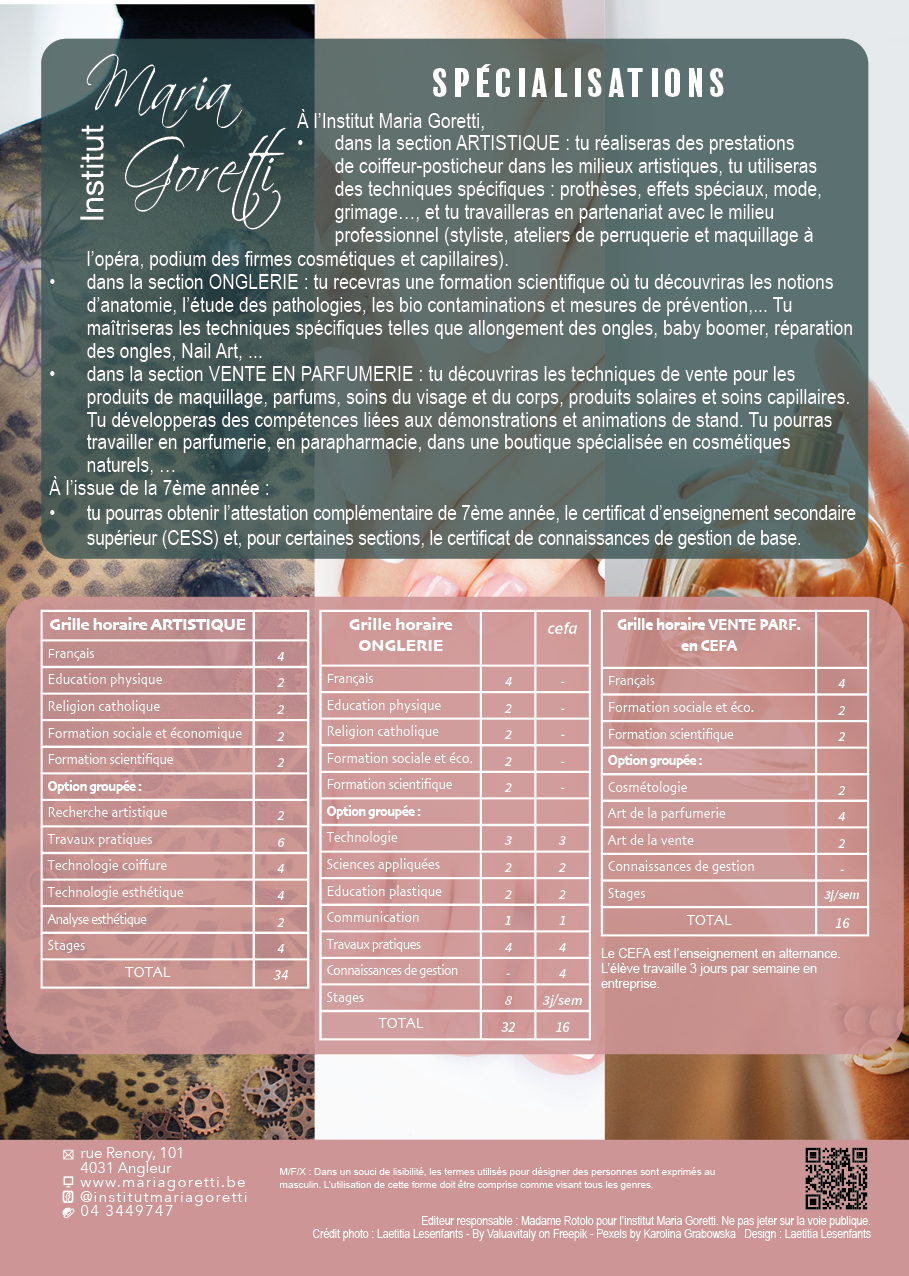 De la 3e à la 7e, des options porteuses de sens et qui t’épanouiront te sont proposées à l’Institut Maria Goretti. Découvre-les ici. Pour obtenir des informations sur le tronc commun et la 2e année (enseignement général), rendez-vous ici.